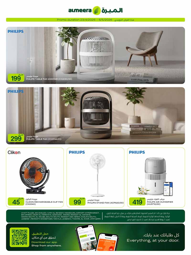 Al Meera Qatar electronics promo: Philips table fans, Clikon rechargeable clip fan, and Philips air humidifier.