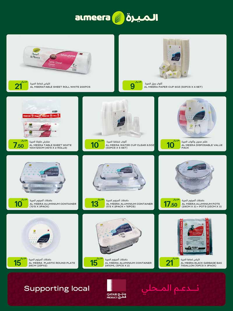 Shop affordable disposable party essentials at Al Meera. This flyer features deals on table sheets, paper cups, aluminum food containers, and garbage bags for your next event.