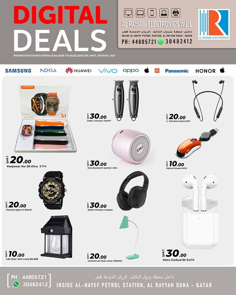 Save big on electronic accessories at Al Rawabi Electronics, Doha. Deals on smartwatches, wireless headphones, kitchen gadgets, and LED lamps. Shop the sale until May 5, 2026.