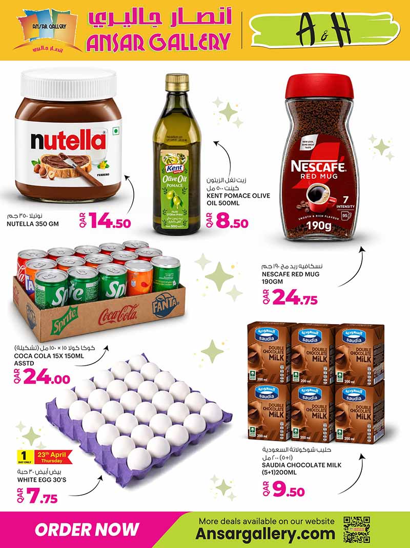 Shop weekend savings at Ansar Gallery Qatar. Deals on Nutella, Nescafe, Coca-Cola, white eggs, and Saudia chocolate milk. Valid April 23-25.