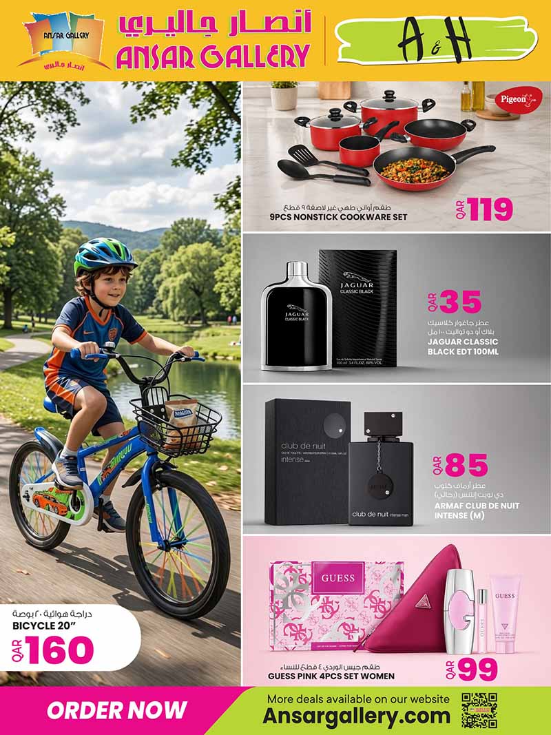 Browse home and lifestyle deals at Ansar Gallery. Featuring discounts on 9-piece cookware sets, luxury perfumes, Guess gift sets, and bicycles.
