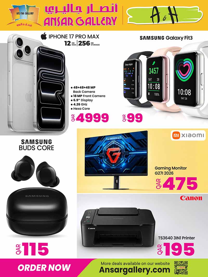 Discover the latest tech offers at Ansar Gallery Qatar. Deals on iPhone 17 Pro Max, Samsung Galaxy Fit3, Buds, gaming monitors, and Canon 3-in-1 printers.