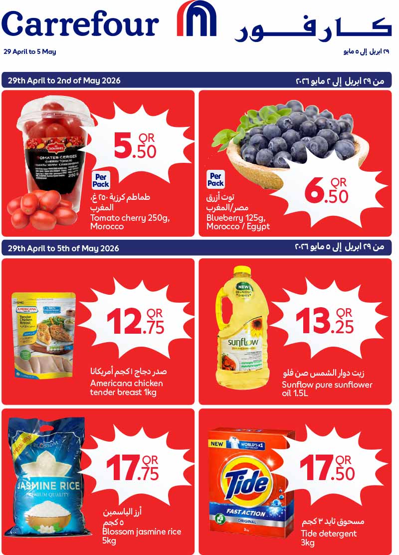 Carrefour Qatar weekly promotion flyer valid from 29th April to 5th May 2026 showcasing deals on fresh produce and groceries: Tomato cherry 250g, Blueberry 125g, Americana chicken tender breast 1kg, Sunflower pure oil 1.5L, Blossom jasmine rice 5kg, and Tide detergent 3kg.