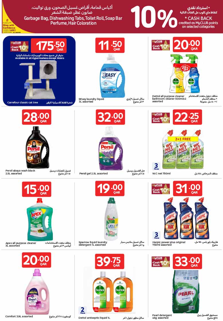 Carrefour Qatar household cleaning products promotion including Persil laundry detergent, Detol all-purpose cleaner, Harpic toilet cleaner, Comfort fabric softener, and Pearl detergent.