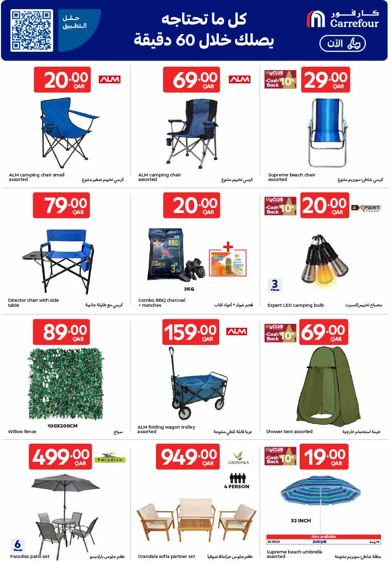 Carrefour Qatar outdoor and camping gear promotion including ALM camping chairs, director chairs, BBQ charcoal, folding wagon trolley, Paradiso patio set, and beach umbrellas.