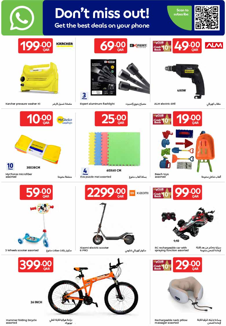 Carrefour Qatar promotional offers on power tools, Karcher pressure washer, Xiaomi electric scooter, Hummer folding bicycle, and various outdoor toys and camping accessories.