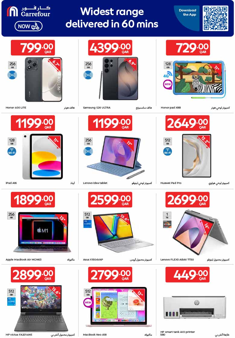 Carrefour Qatar latest technology offers featuring Honor smartphones, Samsung Galaxy, iPad, Lenovo and Apple MacBook laptops, and HP printers.