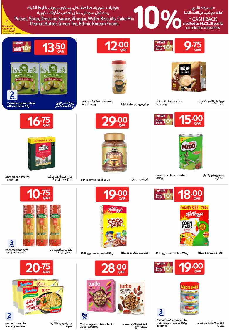 Carrefour Qatar offers on breakfast essentials including Nescafe, Hintz coffee, Kellogg’s cereals, Milo, pasta, and olive products.