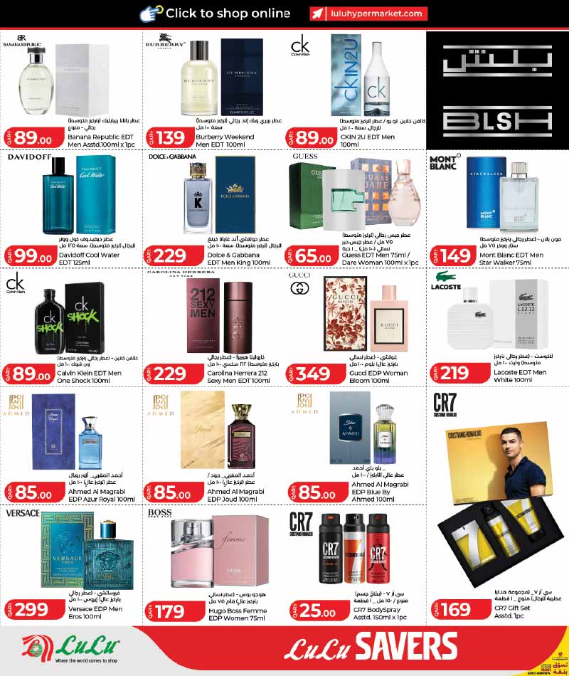 Lulu Hypermarket Savers luxury perfumes section with big discounts on premium fragrances from Davidoff, Burberry, Dolce & Gabbana, Guess, Gucci, Lacoste, Versace, Boss, and Ahmed Al Maghribi.