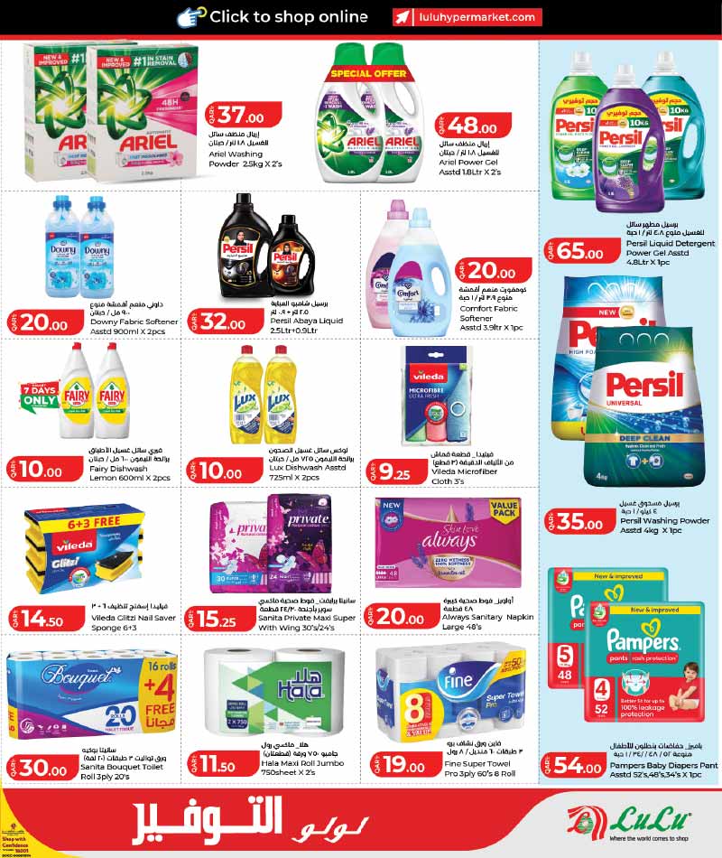 Lulu Savers laundry and hygiene promotion featuring Ariel, Persil washing powder & gel, fabric softeners, toilet rolls, napkins, and Pampers baby diapers at special prices.