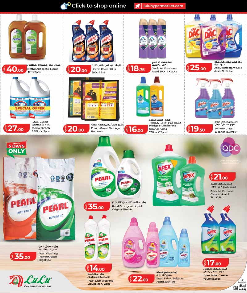 Extensive range of household cleaning products on offer at Lulu Savers including Dettol, Harpic Power Plus, Glade air fresheners, Pearl detergent, Apex all-purpose cleaner, and Windex glass cleaner.