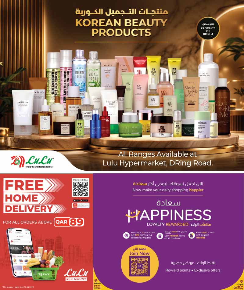 Premium Korean Beauty (K-Beauty) products showcase at Lulu Hypermarket DRing Road branch featuring popular skincare brands and ranges with free home delivery offer and Happiness loyalty program.