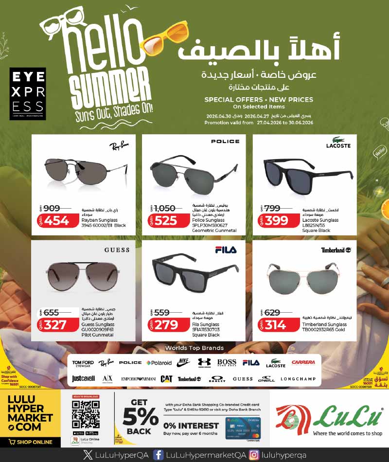 Lulu Hypermarket Eye Xpress Summer sunglasses promotion 2026 featuring premium brands including Ray-Ban, Police, Lacoste, Guess, Fila, and Timberland at discounted prices. Valid from 27 April to 30 June 2026.