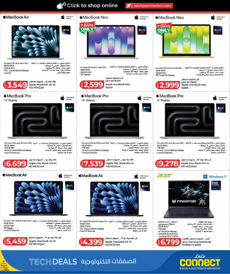 Apple MacBook Air M4, MacBook Pro M5, MacBook Neo, Acer Predator Gaming Laptop at Lulu Hypermarket Qatar Tech Deals