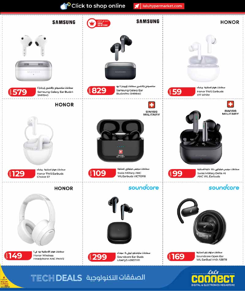Samsung Galaxy Earbuds, Honor TWS Earbuds, Swiss Military Earbuds, Soundcore Earbuds and Honor Headphones at Lulu Hypermarket Qatar Tech Deals