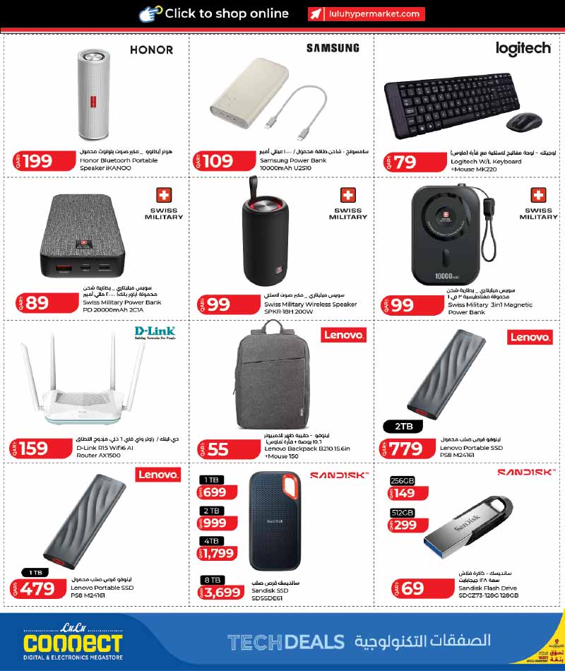 Accessories and storage deals at Lulu Hypermarket Qatar: Honor Bluetooth Speaker, Samsung & Swiss Military power banks, Logitech keyboard & mouse, D-Link router, Lenovo backpack, portable SSDs, and SanDisk flash drives.
