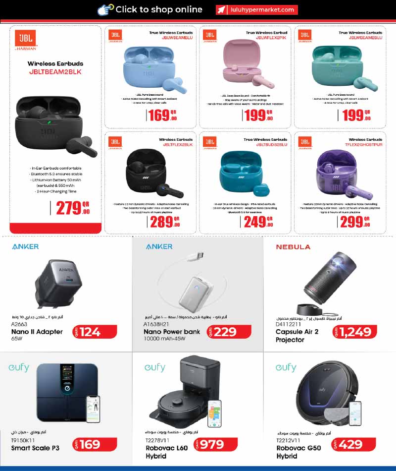 JBL Wireless Earbuds, Anker Nano Power Bank, Nebula Capsule Air 2 Projector, eufy Smart Scale, Robovac L60 and G50 at Lulu Hypermarket Qatar Tech Deals April 2026