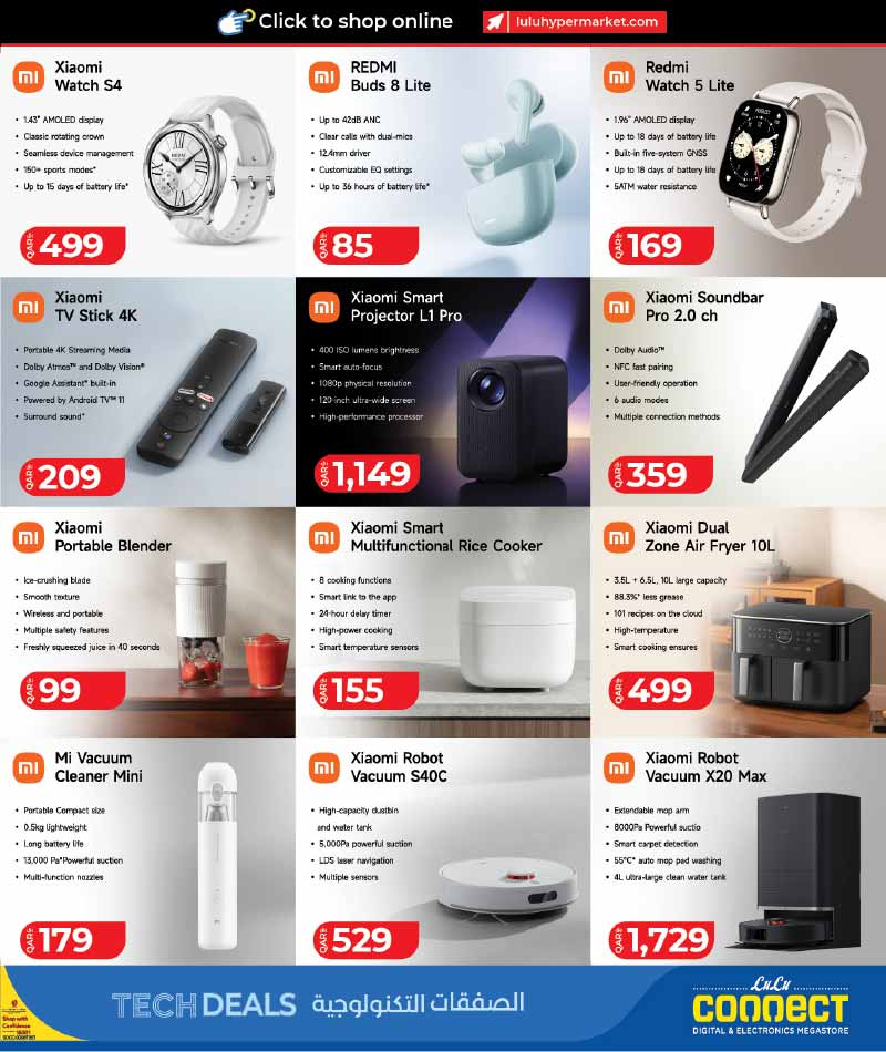 Shop the latest Xiaomi tech in Qatar. Offers include Xiaomi Watch S4, Redmi Buds, Smart Projector L1 Pro, Air Fryers, and robot vacuum cleaners at LuLu Hypermarket.
