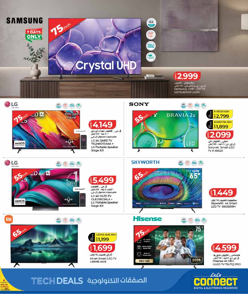 Upgrade your home entertainment with deals on 55-inch to 75-inch 4K LED and OLED TVs. Featuring Sony Bravia, LG QNED, and Samsung UHD displays at LuLu Hypermarket.