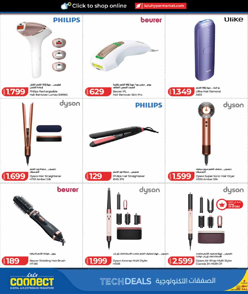 Beauty and hair styling device promotions in Qatar. Shop deals on the Dyson Airwrap, hair straighteners, IPL hair removal kits, and professional dryers from Philips and Beurer.
