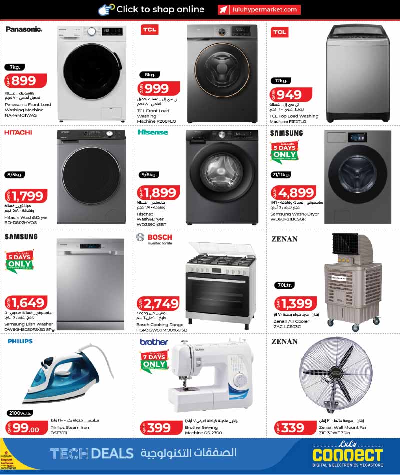 Find competitive prices on laundry and household appliances at LuLu Hypermarket. Includes deals on front-load washing machines, dishwashers, and sewing machines from Panasonic, Samsung, Bosch, and TCL.