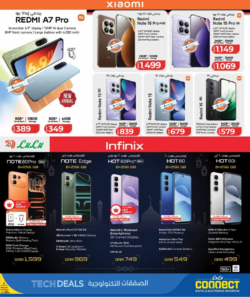 Xiaomi and Infinix latest models on sale at Lulu Hypermarket Qatar: Redmi A7 Pro, Redmi Note 15 series, Infinix Note 60 Pro, Note Edge, Hot 60 Pro and Hot 60 with great discounts.