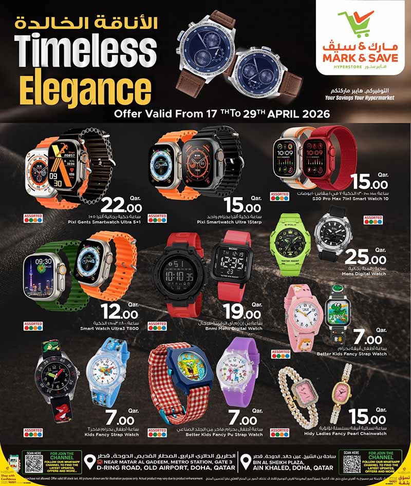 The second page of the Mark & Save “Timeless Elegance” promotion in Doha, Qatar, valid until April 29th, 2026. This flyer highlights affordable tech and fashion accessories, including: