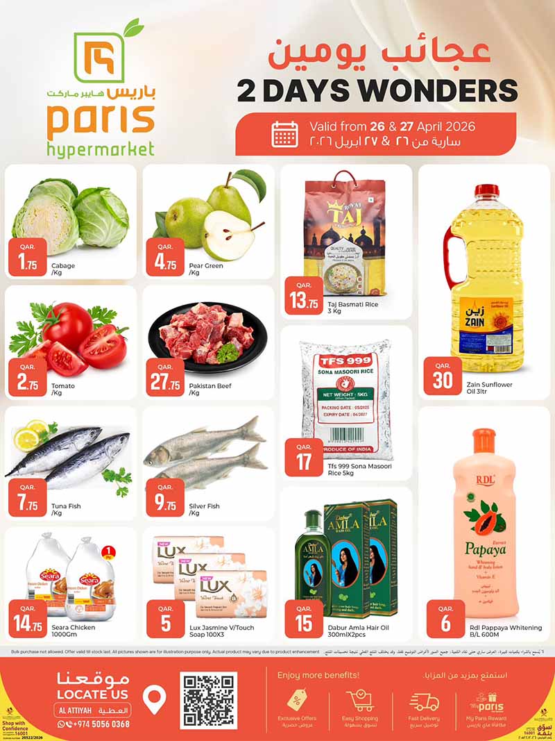 Save on fresh groceries at Paris Hypermarket Al Attiyah. Promotion valid April 26-27, 2026. Discounts on beef, rice, fish, poultry, and pantry essentials.