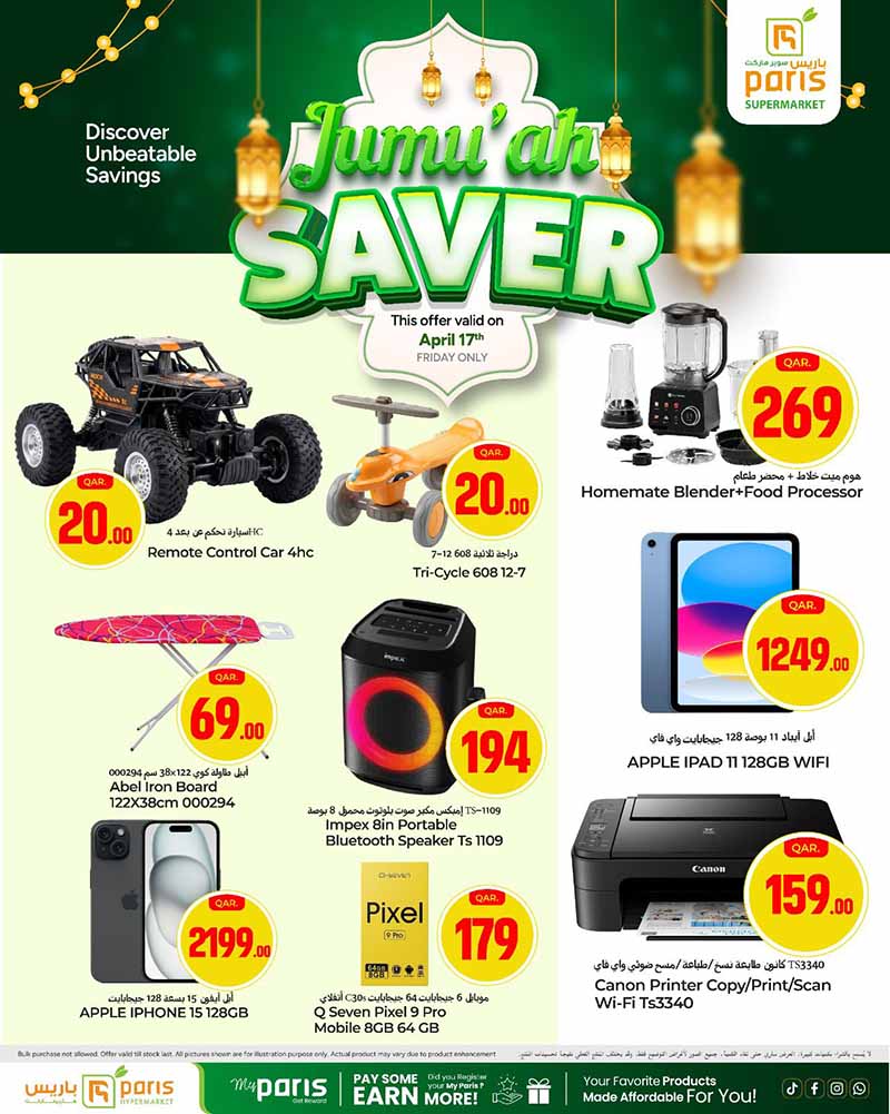 The biggest savings this Friday are in the electronics department! Get the Apple iPhone 15 (128GB) for a stunning QAR 2199.00 or the Apple iPad 11 (128GB WiFi) for QAR 1249.00. Enhance your home with a Homemate Blender + Food Processor for QAR 269 or a Canon 3-in-1 Printer for QAR 159.00. Kids’ toys, including Remote Control Cars and Tri-Cycles, are also available for just QAR 20.00.