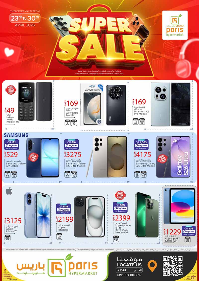 Discover the latest electronics deals at the Paris Hypermarket Super Sale in Al Khor. This promotion, valid from April 23rd to April 30th, 2026, features exclusive prices on top-tier mobile devices and tablets. Highlights include competitive pricing on the Samsung Galaxy S26 Ultra, Apple iPhone 15, and various mobile models. Shop the best hypermarket offers in Qatar this week at Paris Hypermarket, Al Khor. Visit us for limited-time discounts while stocks last.