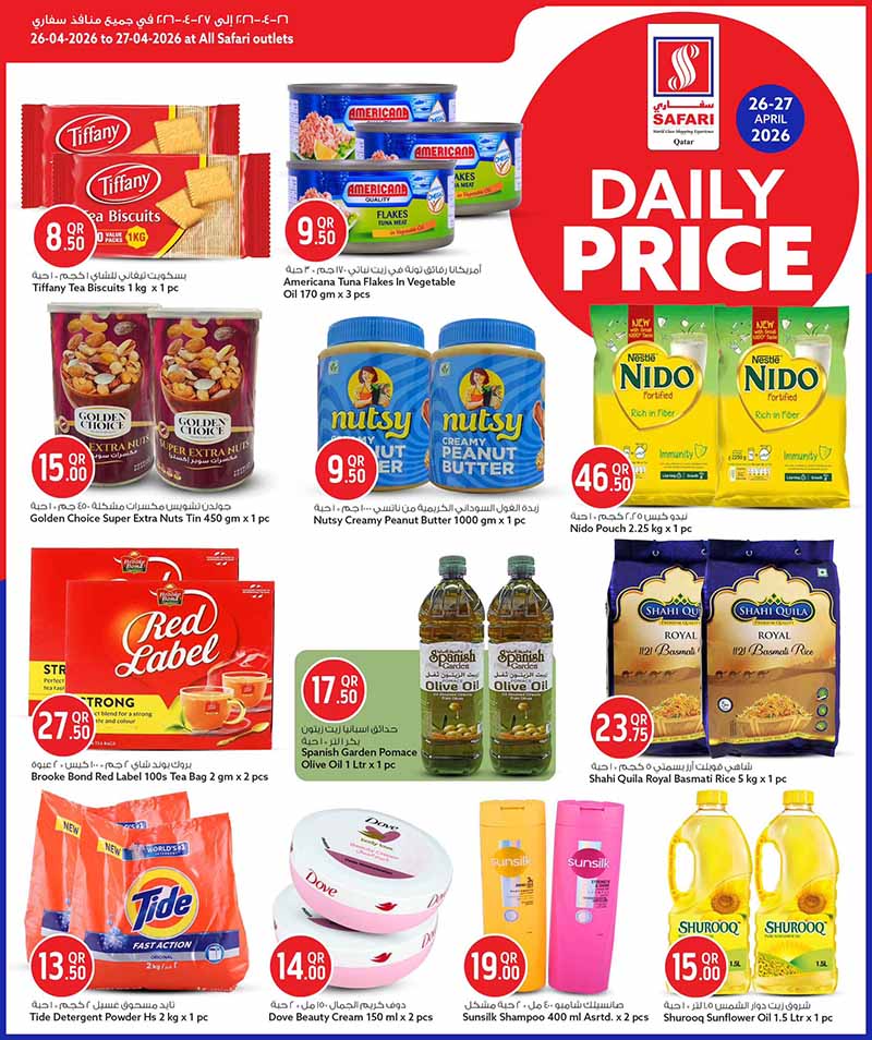 Shop major savings on household pantry staples at Safari Hypermarket Qatar. This daily price flyer includes deals on rice, tea, detergent, cooking oil, and canned goods for April 26-27, 2026.