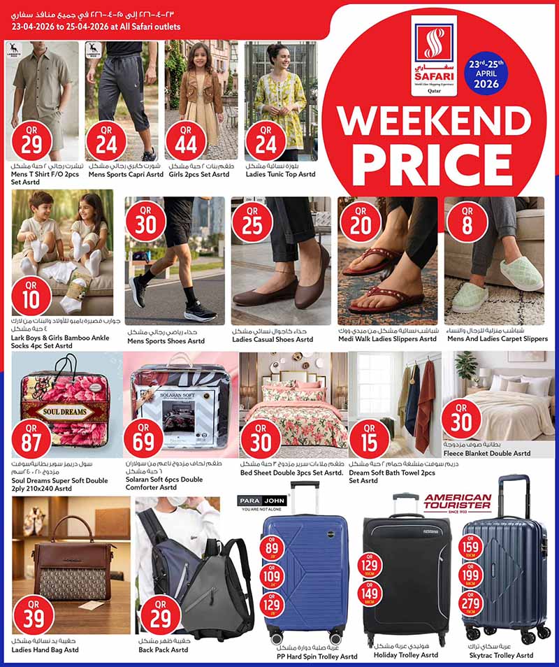 Weekend discounts on clothing, footwear, home textiles, and American Tourister luggage at Safari Hypermarket Qatar, valid until April 25, 2026.