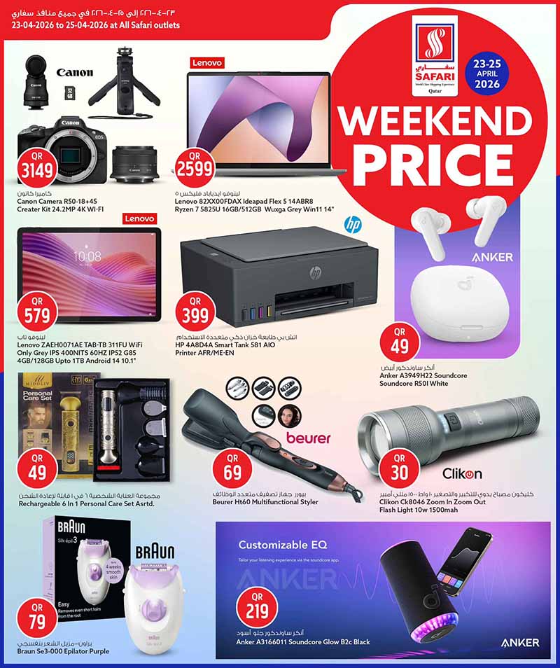 Big savings on electronics, laptops, printers, and personal grooming tools at Safari Hypermarket Qatar. Weekend flyer deals valid for April 23-25, 2026.