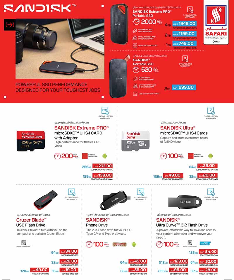 Discounted SanDisk SSDs, memory cards, and USB flash drives available at Safari Hypermarket Qatar. Weekend storage offers valid until April 25, 2026.